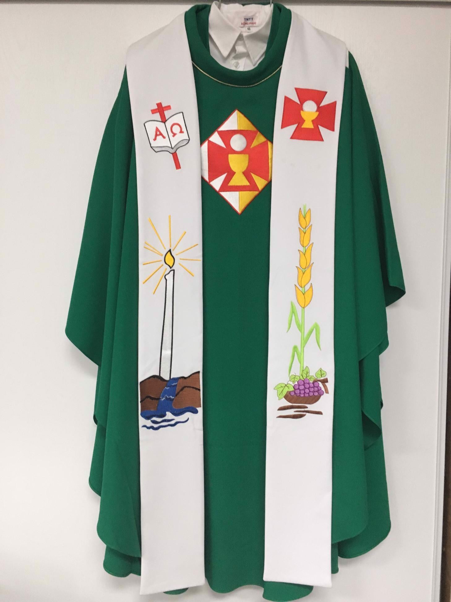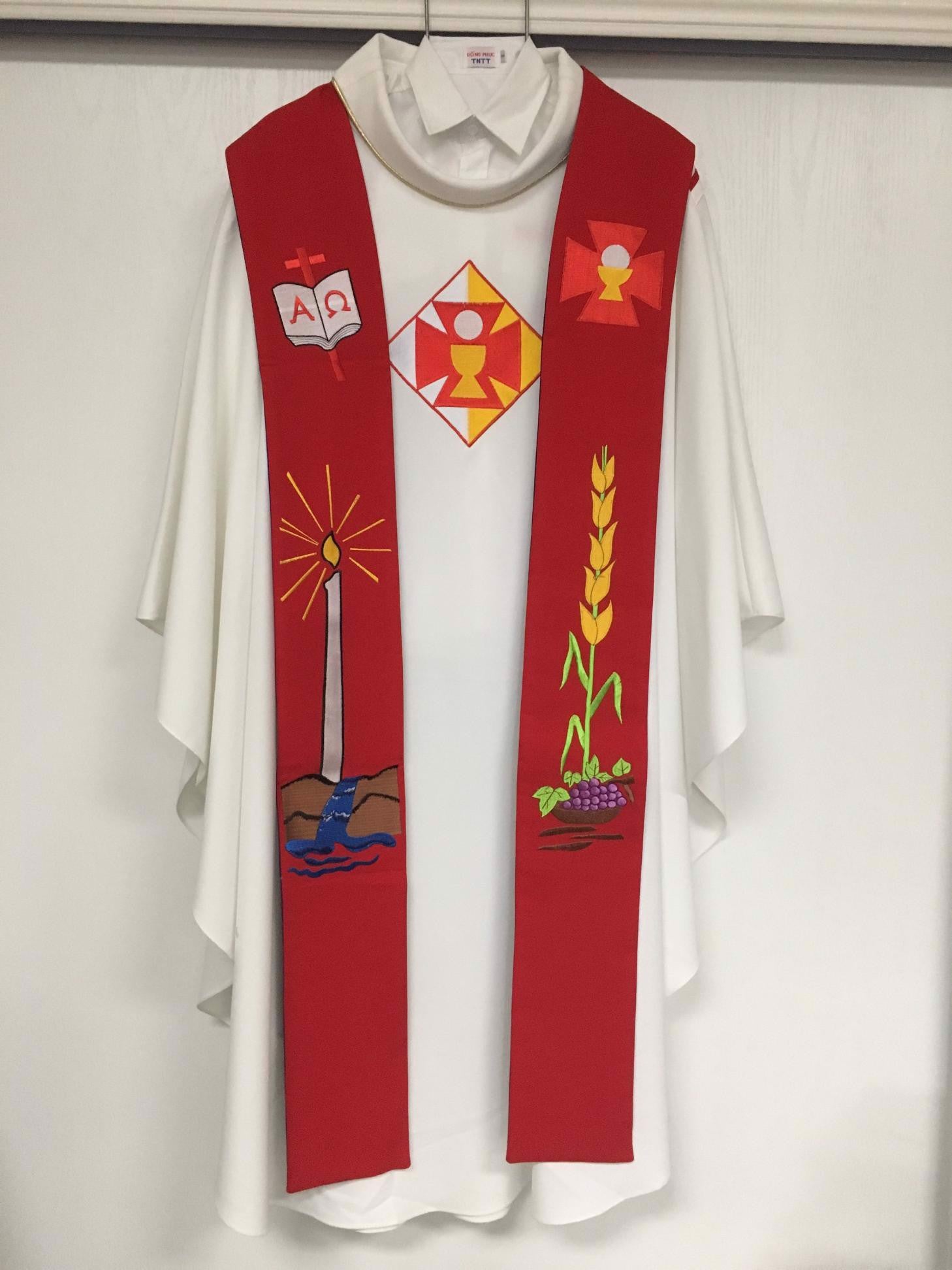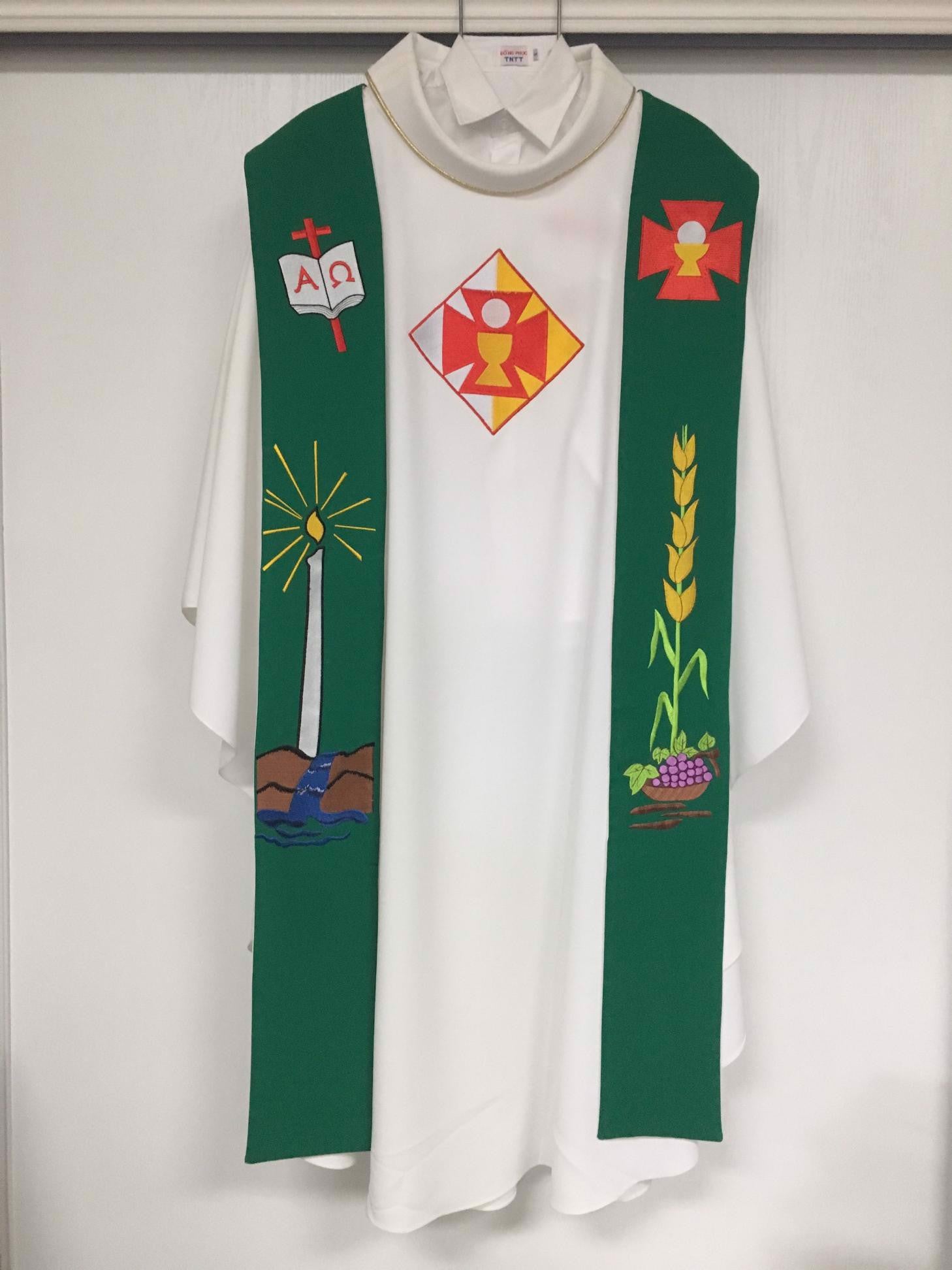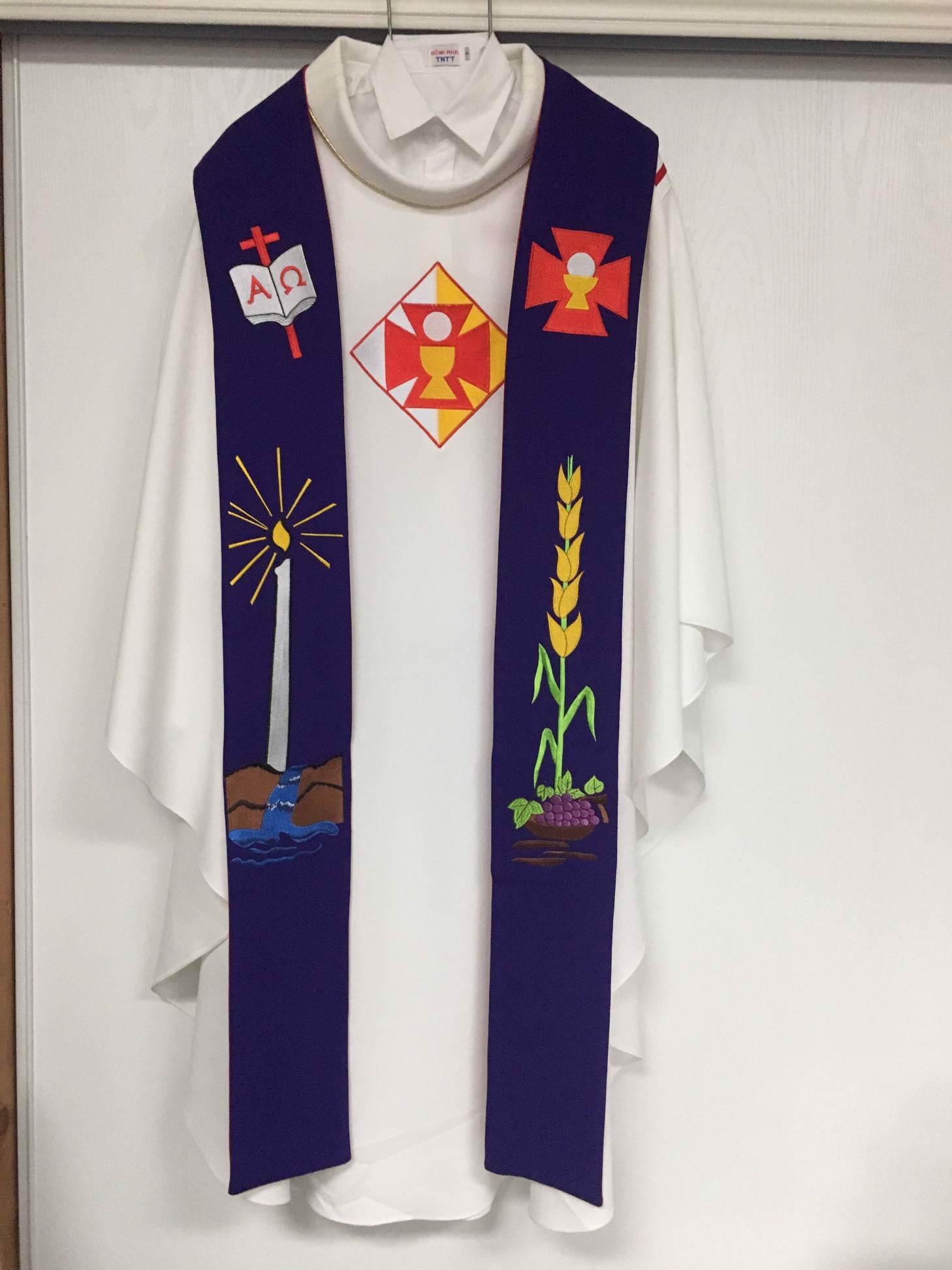 Each stola has a different color on each side. They are paired as Purple/Red and Green/White. Please choose the color when ordering.